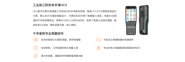 千尋星矩SR1配備專為野外高強(qiáng)度工作而設(shè)計(jì)的HC3手簿,配備了4.3寸卡西歐高清顯示大屏,方便用戶進(jìn)行項(xiàng)目管理、數(shù)據(jù)文件管理、坐標(biāo)系統(tǒng)、基站平移校準(zhǔn)等。